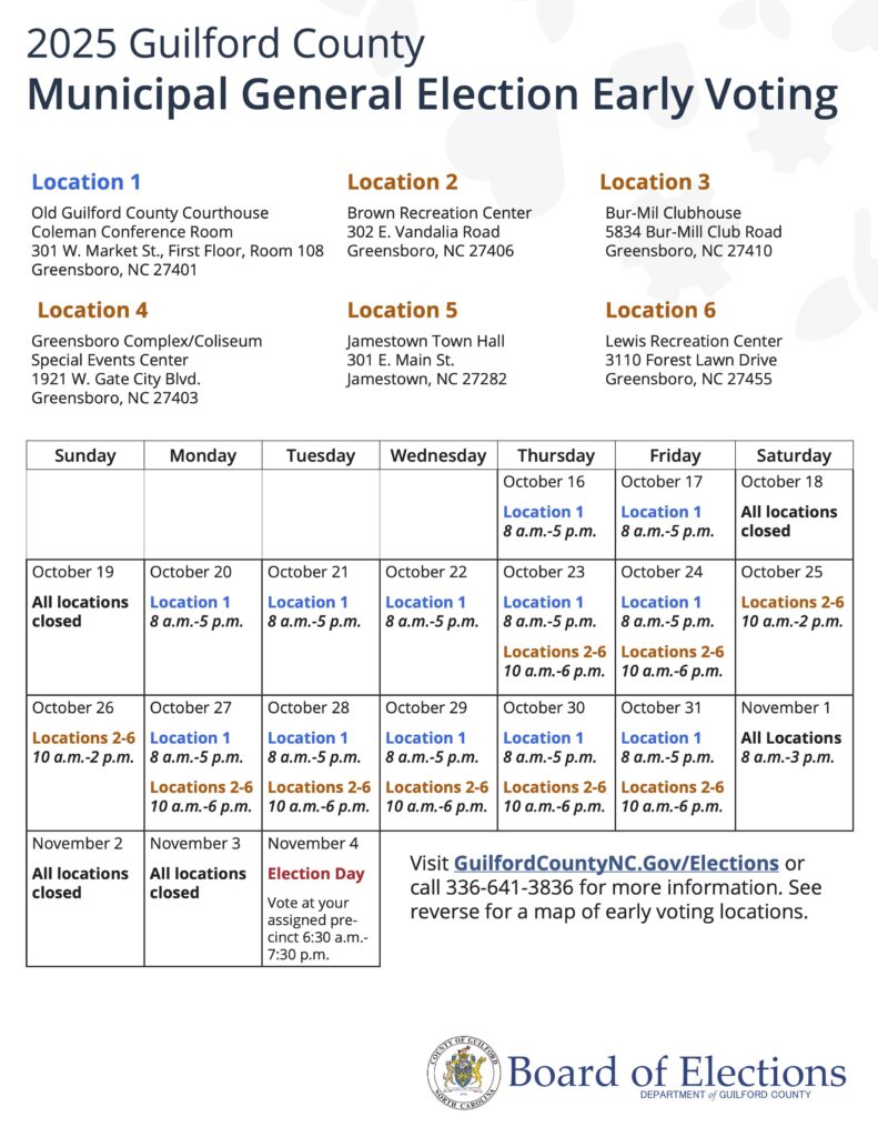 Early voting is available beginning on October 16th in downtown Greensboro and on October 23rd at Town Hall.